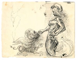 Dessin original à l'encre sur papier figurant une femme nue caressant la joue d'un personnage ailé à corps de lion.