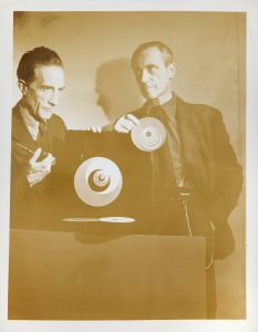 [DUCHAMP Marcel]. MARCEL DUCHAMP ET SES ROTORELIEFS ET HANS RICHTER. PHOTOGRAPHIE ORIGINALE, 1947. 26 x 20 cm, sous passe-partout. Tirage argentique d'époque titré au verso: «Marcel Duchamp dreams that money can buy», portant le cachet Estate...