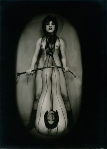 Tirage argentique d'époque représentant le petit vampire, modèle féminin de Molinier à la cravache derrière les jambes gainées de bas à résille de Molinier.