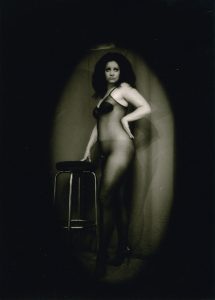 Tirage argentique d'époque représentant le célèbre modèle féminin de Molinier posant près d'un tabouret.