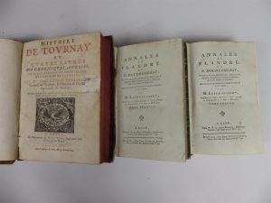 8°, dos détachés, intérieur frais Joint : Jean Cousin - Histoire de Tournay ou quatre livres des chroniques annales et démonstration du christianisme de l'evesché de Tournay - A Douay, Wyon, 1619, in 4°, 2 parties sur 4 / Duthilloeul 595, 15 portraits gravés, pl veau époque accidenté Ensemble 3 volumes