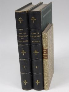 [Picardie] Peigné-Delacourt - Histoire et cartulaire de l'abbaye de Notre Dame d'Ourscamp de l'ordre de Citeaux fondée en 1129 Amiens, Lemer, 1865, 2 vol in 4° Cartulaire et histoire ; 620pp et 296pp, ½ chagrin noir époque. Bel ensemble Joint :...
