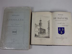 Théodore Leuridan - Histoire de Linselles - Lille, Danel, 1883, gd in 8°, broché, 261pp, 8 lithographies, châteaux, etc. Rare (qqs mouillures aux planches) Joint : Bedu - Histoire de Bapaume - Arras, Rousseau, 1865, in 8°, 1/25 percaline (acc.)