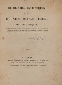 [Médecine]. CLOQUET (Jules-Germain). Recherches anatomiques sur les hernies de l'abdomen. Paris, Méquignon-Marvis, 1817. In-4, 96 p., 4 planches anatomiques, demi-toile à la Bradel rouge brique, dos lisse, pièce de titre noire en long, tranches...