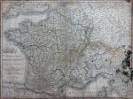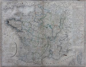 - Carte générale du Royaume de France divisé en départements […], 1816. Carte gravée en coloris d'époque. Pliure centrale, déchirure, mouillures, salpêtre sur la partie droite et tâches. Carte non examinée hors de la marie-louise et du cadre. 55 × 74 cm (à vue).