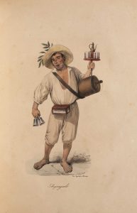 [Italie]. DURA (Gaetano). [Recueil de 11 planches lithographiées et aquarellées, montrant des personnages italiens en costumes traditionnels]. Napoli, Lit. Gati et Dura, [vers 1850]. Petit in-folio, demi-chagrin vert bronze époque, dos lisse et...