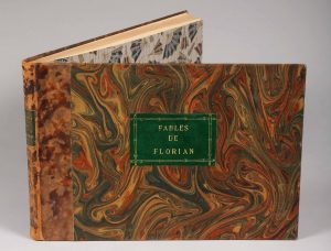 FLORIAN (Jean-Pierre Claris de). Fables choisies… illustrées par des artistes japonais sous la direction de P. Barbouteau. Paris, Flammarion, [1895]. 2 volumes in-4 oblong, reliure de l'époque demi-basane havane racinée, dos lisse, pièce de...
