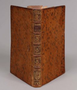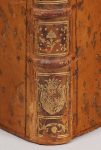 titre maroquin grenat, caissons ornés, armes frappées en queue, filet doré aux coupes, tranches rouges (menus frottements, pâle mouillure au titre et gardes, qq. f. brunis au début du vol.).