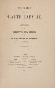 " Il raconte un voyage qu'il fit en 1853 d'Alger à Dar-el-Mizan pour aller trouver Beauprêtre qui y commandait : la politique de Beauprêtre si redouté des Kabyles. Hun le quitte et entre dans la haute montagne de la grande Kabylie ; il en parcourt certaines parties ; il fait l'ascension du Lella-Khedidja ; il note qu'il est le premier chrétien qui ait pénétré ostensiblement chez les Zouaoua. Des anecdotes ; des traits de mœurs ; la saleté et la crasse des femmes kabyles " (Tailliart).