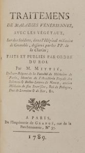 [Médecine]. MITTIÉ (Jean-Stanislas). Traitemens des maladies vénériennes avec les végétaux, sur des soldats, dans l'Hôpital militaire de Grenoble, desservi par les P. de la Charité ; faits et publiés par ordre du Roi. Paris, Grangé, 1789....