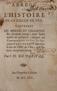PARIVAL (Jean-Nicolas de). Abrégé de l'histoire de ce siècle de fer. Contenant les misères et les calamités des derniers temps, avec leurs causes et prétextes, jusques au couronnement du roi des Romains Ferdinand IV, fait vers la fin de l'été...