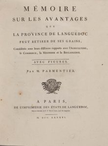 PARMENTIER (Antoine-Augustin). Mémoire sur les avantages que la Province de Languedoc peut retirer de ses grains, considérés sous leurs différens rapports avec l'Agriculture, le Commerce, la Meunerie & la Boulangerie. Avec figures. À Paris, de...