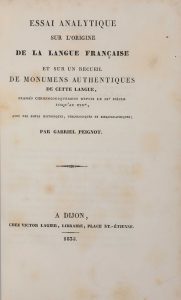 PEIGNOT (Gabriel). Essai analytique sur l'origine de la langue française, et sur un recueil de monumens authentiques de cette langue, classés chronologiquement depuis le IXe siècle jusqu'au XVIIe, avec des notes historiques, philologiques et...