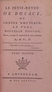 [PLUCHON-DESTOUCHES]. Le petit-neveu de Bocace, ou Contes nouveaux en vers. Nouvelle édition, revue, corrigée & augmentée de deux volumes. par M. Pl. D. Amsterdam, s.n., 1787. 3 vol. in-8, 226-[2], [4]-230-[2] et 222-[2] p., cartonnage à la...
