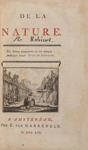 [ROBINET (Jean-Baptiste-René)]. De La Nature. À Amsterdam, Chez Harrevelt, 1761. In-8, XX-456 p., frontispice, bradel papier bleu moderne. Édition originale de ce traité de J.-B.-R. Robinet (Rennes, 1735 - 1820), philosophe et censeur royal. Elle...