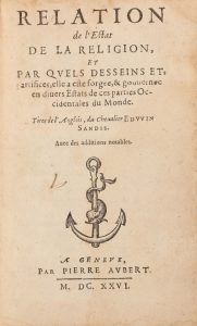SANDYS (Edwin). Relation de l'estat de la religion, et par quels desseins et artifices, elle a esté forgée & gouvernée en divers Estats de ces parties occidentales du monde. Genève, Pierre Aubert, 1626. Petit in-8, [8]-323-[4] p., veau brun...