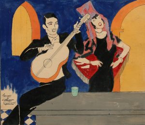 d'ALBIGNAC (François) (1903-1958). Guitariste et chanteuse espagnole. Gouache sur papier, signé en bas à gauche et daté 3 janvier 1947. 17,3 × 20 cm.