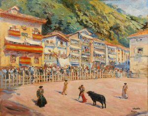 BERTIN (E.). Corrida à Pasages. Peinture sur toile, signée en bas à droite, située et datée [19]29. 65 × 80 cm.