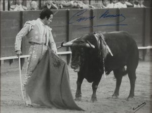 [Curro Romero] [Desplante] [Derechazo]. CANO (Francisco) (1912). Deux photographies argentiques en noir et blanc : desplante et derechazo de Curro Romero ; dédicacées. 17 × 23 cm.