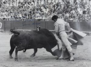 [Curro Romero] [Demi véronique]. Photographie en noir et blanc : demi véronique de Curro Romero dans les arènes de Séville ; dédicacée. 28,2 × 38,5 cm.