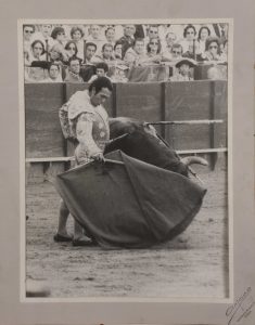 [Curro Romero] [Derechazo]. Photographie en noir et blanc : derechazo de Curro Romero dans les arènes de Séville sous le regard d'Antonio Ordones (?). 38 × 28,5 cm.