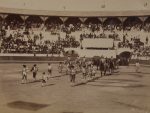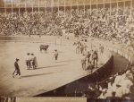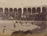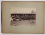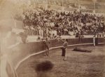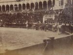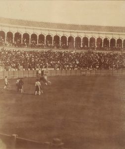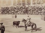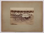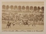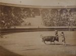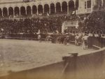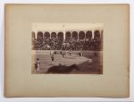 Arène de Séville : pose de banderilles. Photographie. 24,5 × 21 cm. Sous-verre encadrée. On joint : Douze photographies albuminées contrecollées sur carton : picadors, arènes d'Algesiras, Procession, scènes de Lidia. Dernier quart du XIX°...