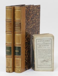 On JOINT un volume de l’Annuaire du Département de l’Aube pour l’An XII [1803-1804] ; fort vol. in-16, broché, couverture de papier à la colle bleu.