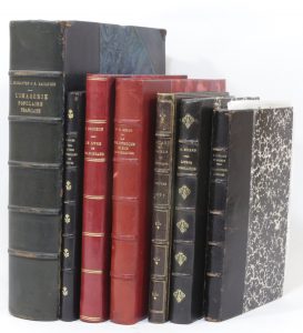 [BIBLIOGRAPHIES.- IMPRESSIONS POPULAIRES]. Ensemble de 7 bibliographies sur les livres de colportage, les impressions populaires, l’impression à Troyes et en Normandie. 7 vol. in-8 à in-4, demi-reliures et reliure. • SOCARD (Alexis), ASSIER...