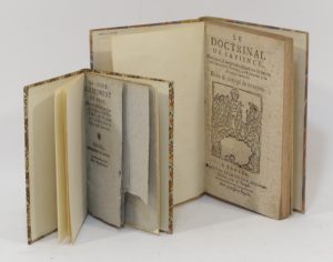 [BIBLIOTHÈQUE BLEUE]. Deux ouvrages de colportage et impressions populaires. 2 vol. in-12, bradels modernes. • Le Doctrinal de Sapience, dans lequel est compris & enseigné tous les devoirs des véritables chrétiens, pour parvenir à la...