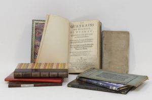 • Les Quatrains du Seigneur de Pybrac, […] contenant les Préceptes & enseignemens profitables pour tous chrétiens. Avec les Quatrains du Président Favre : ensemble les Quatrains de la Vanité du monde. Paris, Veuve Nicolas Oudot, 1681, 80 p., maroquin bleu nuit, dos à nerfs, petite dentelle intérieure dorée, tranches dorées, [Capé].