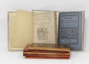• Nouveau catéchisme poissard, Recueil indispensable pour passer gaîment le carnaval. Dédié aux amis de la joie. Troyes, Baudot, s. d., couverture bleue imprimée et ornée d’une vignette conservée.