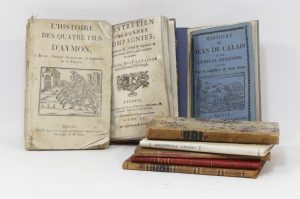 [BIBLIOTHÈQUE BLEUE]. Neuf ouvrages de colportage et impressions populaires. 9 vol. in-12, brochés ou en demi-reliures modernes. • L’Histoire des quatre fils d’Aymon, revue, corrigée de nouveau, et augmentée de 25 figures. Limoges, P....