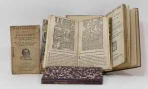 [BIBLIOTHÈQUE BLEUE]. Quatre ouvrages de colportage et impressions populaires. 4 vol. in-12, brochés ou en demi-reliures modernes. • CRASSET. Préparation à la à la [sic] mort. Troyes, Jean Oudot, 1750. Feuillet de titre sali. A échappé à...