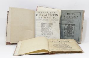 • Le Second livre de Huon de Bordeaux, pair de France, duc de Guienne, contenant les faits & actions héroïques, mis en deux livres aussi beaux & divertissants que l’on ait jamais lu. Troyes, Veuve Garnier, s. d., couvertures bleues conservées.