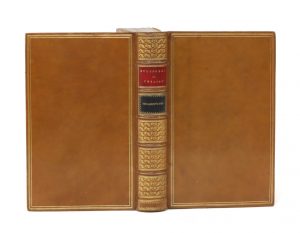 encadrement de trois filets dorés sur les plats, dos à nerfs orné de motifs dorés à la grotesque, pièces de titre rouge et d’édition noire, tranches dorées, [Petit SuccR de Simier].