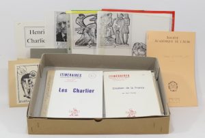 [CHARLIER (Henri)]. Ensemble de documents relatifs au sculpteur Henri Charlier. , réunis dans une boîte cartonnée in-4. On y trouve des ouvrages rédigés par lui ou sur lui, son ex-libris en plusieurs exemplaires, des photographies de ses...