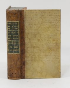 vol. in-12, demi-veau marbré, plats de parchemin manuscrit de réemploi, dos lisse, longue pièce de titre verte, tranches cailloutées, [Rel. de l'époque], dos un peu frotté, petites galeries de vers.