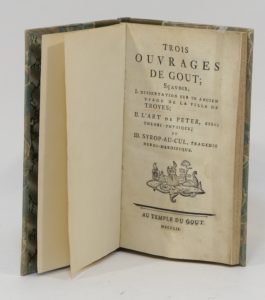 [GROSLEY, HURTAULT ET RACOT]. Trois ouvrages de gout ; sçavoir, I. Dissertation sur un ancien usage de la ville de Troyes ; II. L’Art de péter, essai theori-physique ; et III. Syrop-au-cul, tragédie heroi-merdifique. S. l., Au Temple du gout,...