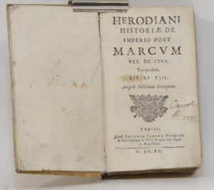 Rare impression troyenne du XVIIe siècle [HÉRODIEN]. Herodiani historiæ de Imperio post Marcum Vel de suis temporibus. Libri viii. Trecis [Troyes], Jacobum Febure, 1690 ; pet. in-12, parchemin souple muet, [Rel. de l'époque]. L’Histoire...