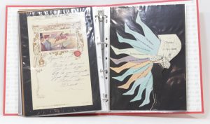 [MENUS]. Collection de 28 menus. réunis sous pochettes plastique dans un classeur, . Belle réunion de 28 menus imprimés, certains en couleurs, parfois écrits à la main. La plupart concernent Troyes et la Champagne. Cette collection est...