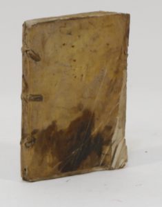 sur trois lanières de cuir sortant en mors et rentrant à travers les plats, traces d’écriture sur le premier plat, [Rel. de l'époque].