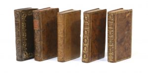 étroit, reliures de l’époque en veau ou chagrin, dos lisses ornés de motifs dorés, tranches dorées (sauf un vol.), menus frottements.