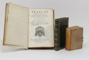 [TROYES].— CHAVIGNY (Denys François Bouthillier de). Statuts synodaux, ordonnances, et règlemens pour le diocêse deTroyes. Troyes, Charle Briden & Jaque Oudot, 1706 ; in-8, parchemin granité, dos à nerfs, titre manuscrit, [Rel. de...