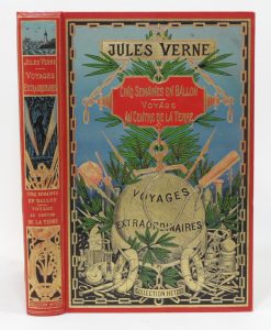 VERNE (Jules). Voyages extraordinaires. Cinq semaines en ballon et Voyage au centre de la Terre. Paris, J. Hetzel et Cie, [vers 1896] ; gr. in-8, cartonnage d'éditeur toile rouge, plats ornés d'un vaste décor doré et polychrome, dos orné de...
