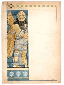 4 grands dessins à l'encre de Chine et aquarelle inspirés des antiquités assyriennes, qui seront clichés pour orner la partition chant et piano de l'opéra.