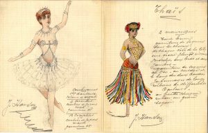 Manuscrit expliquant la chorégraphie du Divertissement de l'opéra de Massenet, suivi de 4 dessins au crayon et à l'aquarelle des costumes des danseuses.