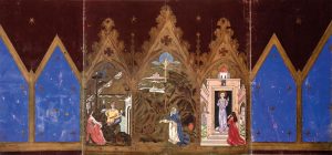 Maquettes de décor pour l'opéra de Respighi Maria Egiziaca, créé au Teatro Goldoni à Venise le 10 août 1932, représentant le triptyque doré avec les anges, fermé ; puis le tripyque ouvert avec le décor des trois scènes. On joint le plan de plantation du décor, et 2 planches imprimées et aquarellées pour les costumes.