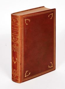 Paris, Manzi, Joyant & Cie, 1913. Un vol In-8°, rel. Du temps plein maroquin brique à grain long, filet doré encadrant les plats avec massacre aux angles, dos lisse orné de symboles cynégétiques, tête dorée, charmants fers cynégétique sur les bandeaux des contre-plats. Couverture conservée (Durvand). E.L. Héraldique da la Rochefoucauld duc de Bissacia.