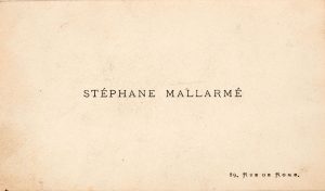 Quatrain manuscrit à l'encre noire au dos d'une carte de visite de Stéphane Mallarmé, 89 rue de Rome. « Ce Papier, comme si Dauphin/ Y piquait mainte tache noire !/ Pour vous, témoins discret et fin/ Cache le fruit couvert de gloire. »