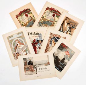 Ensemble des 3e, 4e et 5e livraisons de ce numéro consacrée au concours d'affiches, organisé par le quotidien L'Éclair de Paris à la fin , et dont Mucha fut membre du jury. 8 planches par livraisons représentent les compositions des participants parmi lesquels Émile Laboureur, Maurice Feuillet, Henri Dubois, Henri Béguin ... Légères usures des chemises de couvertures. Bel ensemble d'iconographie Art Nouveau.